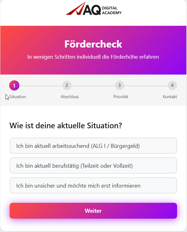 Prüfe in 3 Klicks kostenlos, welche Förderung du für deine Weiterbildung erhältst – persönlich & unverbindlich.